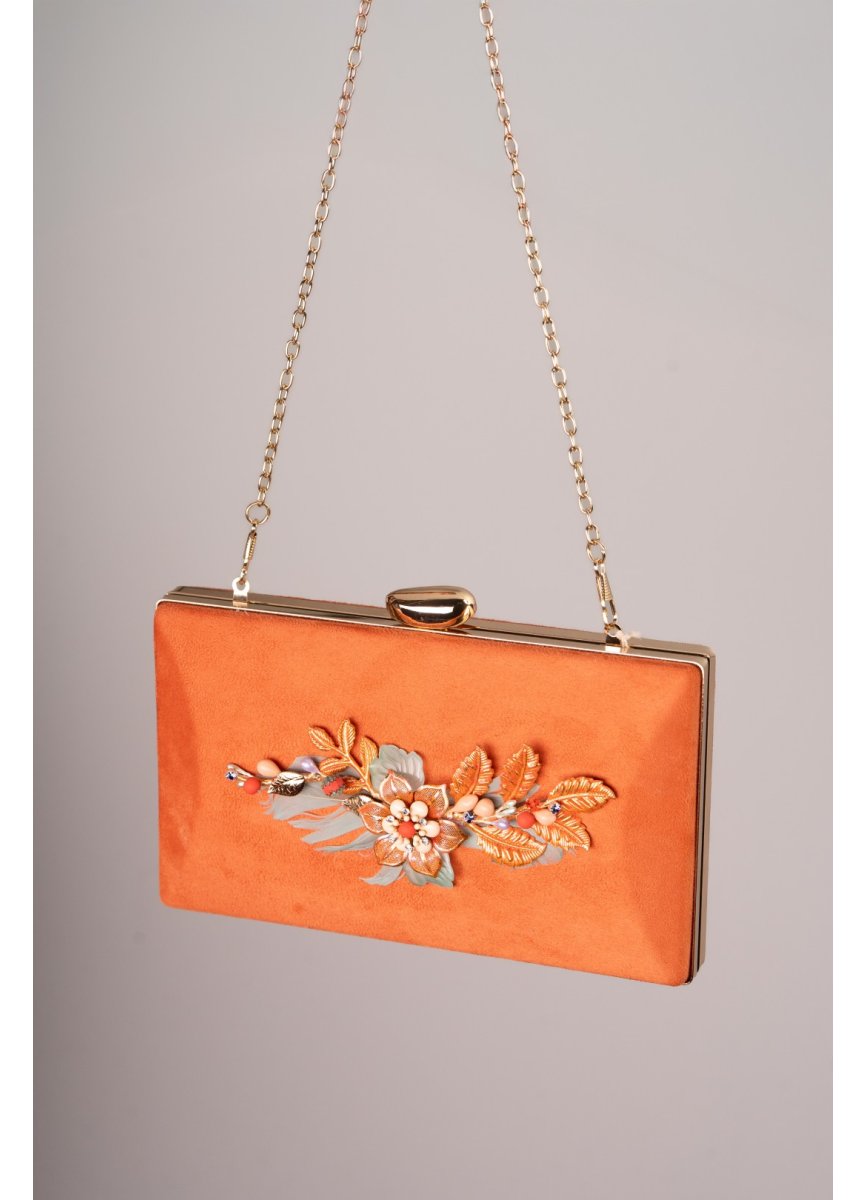 Orange rectangular bag with gold drop-shaped closure. Central ornament with metal and enameled flowers. Metal leaves painted on the sides with some balls and pistils. Measurement 20.5cm. x 12cm. X 3cm. Approx.