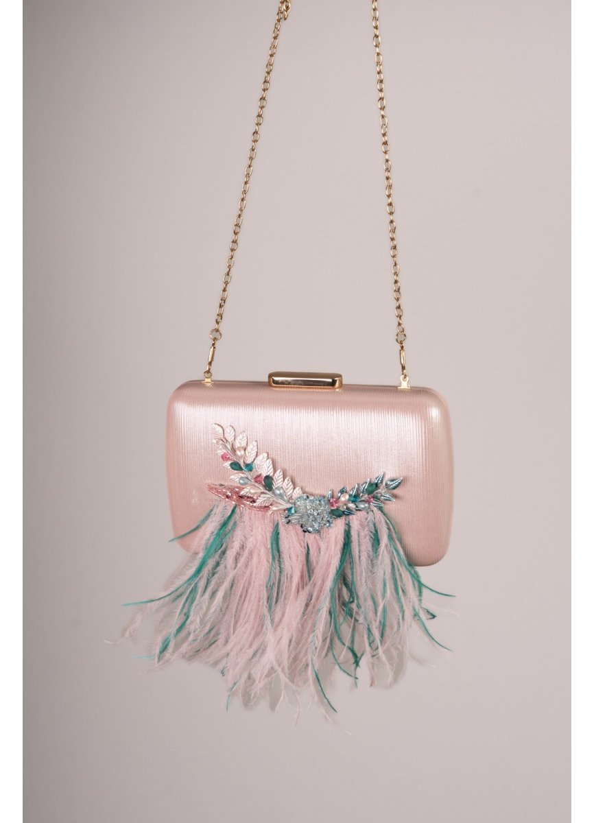 Rectangular bag in pink with a slight grated relief. Ornament in metal leaves, pistils, balls and rhinestones in pale pink and turquoise tones. Matching the tones, ostrich feathers give fluidity. Measurement 19cm. x 12cm. Approx.