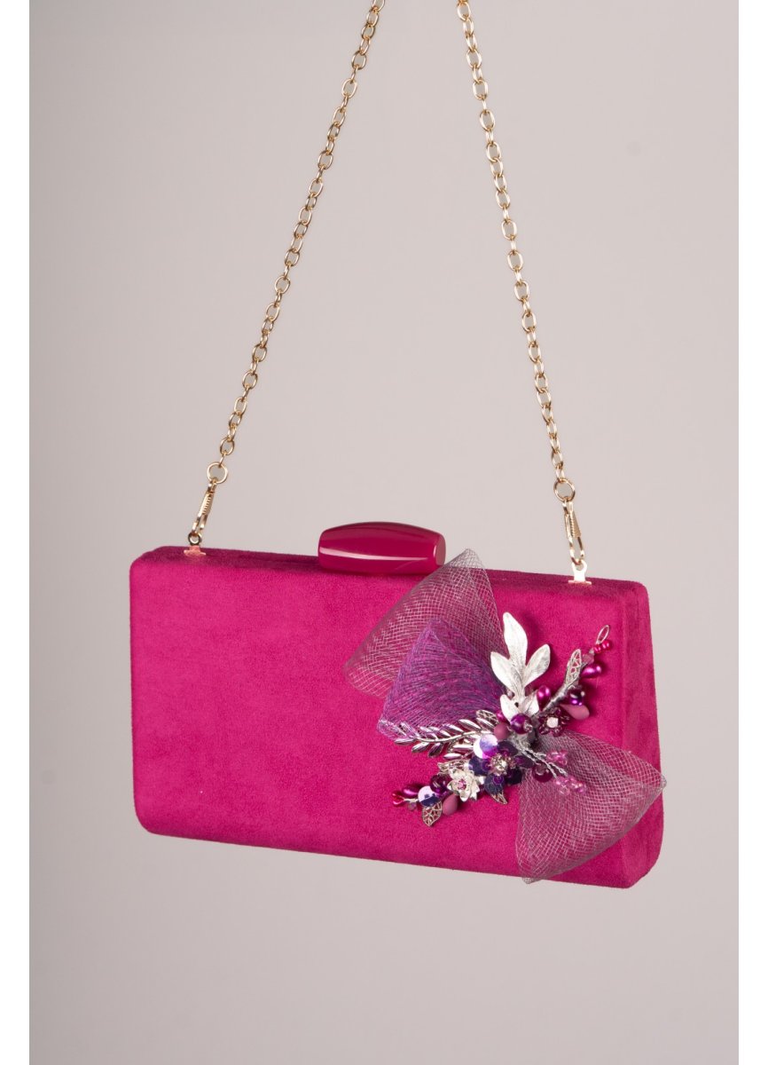 Elongated bougainvillea bag with matching resin closure. Horsehair bow adorning one side with silver metal leaves, balls, pistils and some varied flowers in metal and resin. Measurement 20cm. x 10.5cm. X2, 5cm. X4cm. Approx.