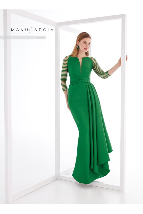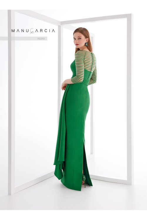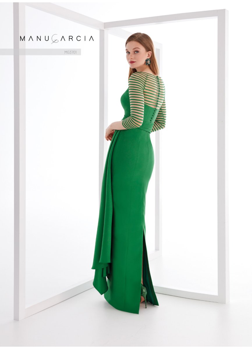Midi couture dress. made of piqué. The bodice features an open bateau neckline. that enhances the bust. This design stands out for its raglan sleeves and semi-transparent back. with an artisanal bias work. done in the same fabric. The waist is cinched with an asymmetrical pintuck sash. that ends in a large bow cascading over the pencil skirt.