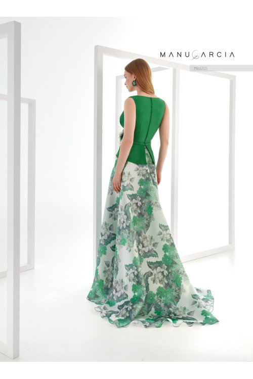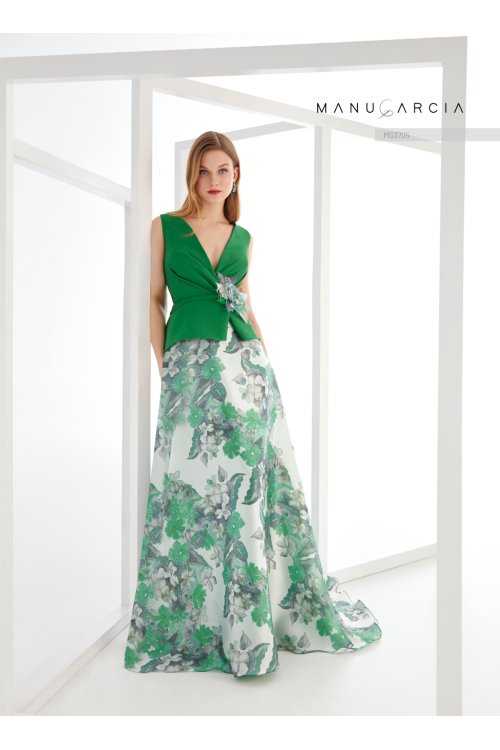 Simply spectacular long evening gown. made of printed gazar and piqué. With a youthful style. it features a fantasy A-line skirt. full of movement and lightness. The bodice. made of piqué. includes a draped V-neckline at the waist. a high back. sleeveless design. and a peplum. adorned with a flower.