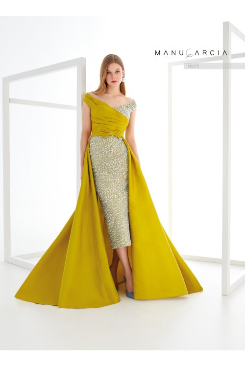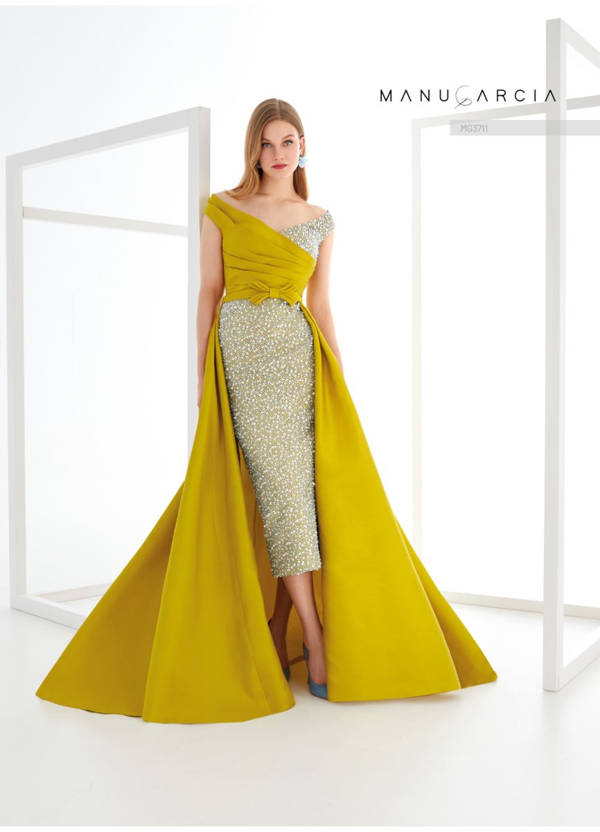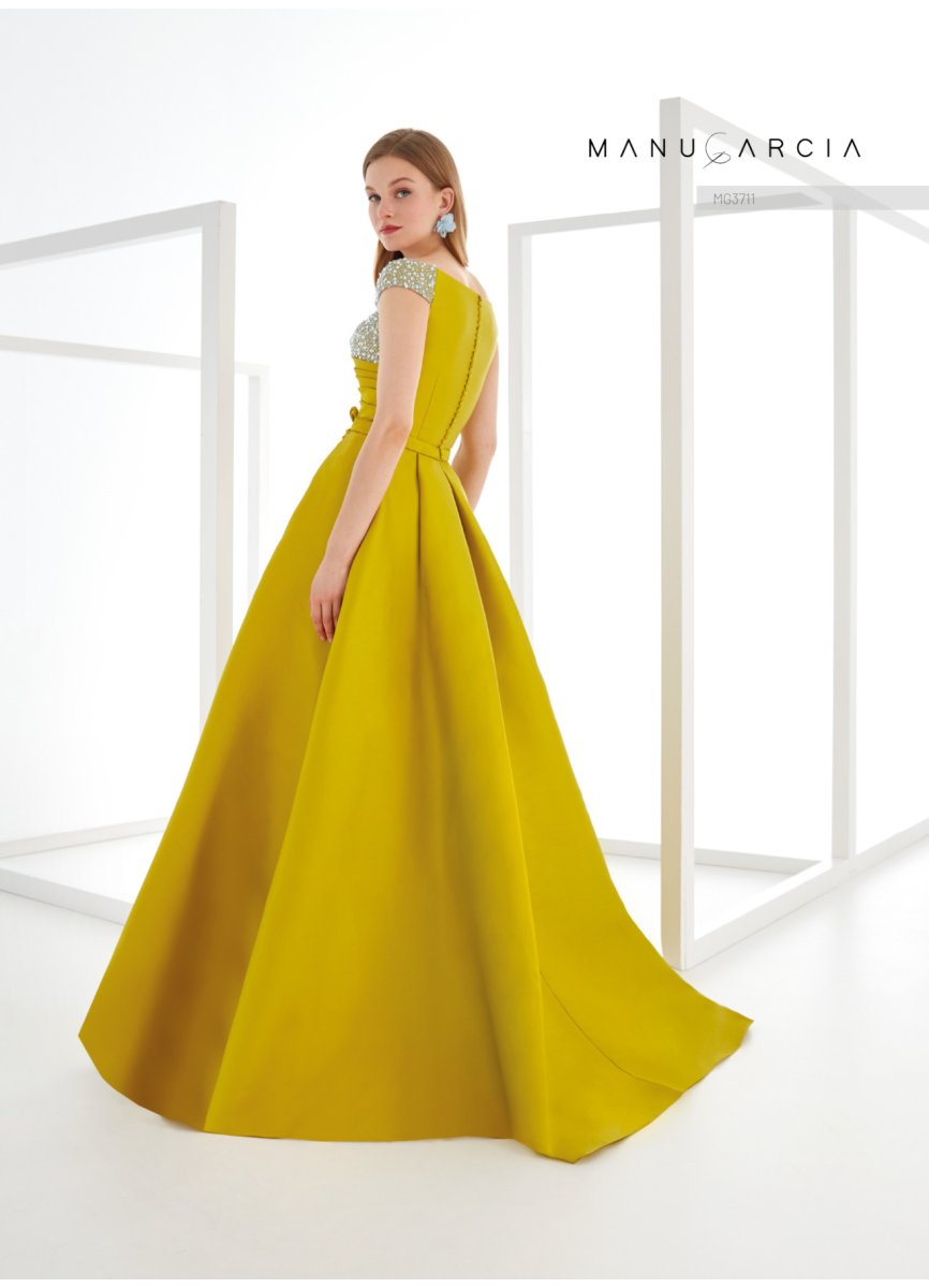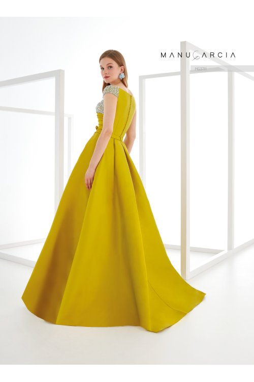 Couture midi dress. crafted in fantasy tulle and mikado. The bodice features a V-neckline with pintucks on one side and tulle on the other. with a dropped shoulder. The back is high. The waist is adorned with a belt. featuring an original bias bow. leading to a fitted skirt with an asymmetric mikado overskirt. A very sophisticated style. that will stand out at any event.
