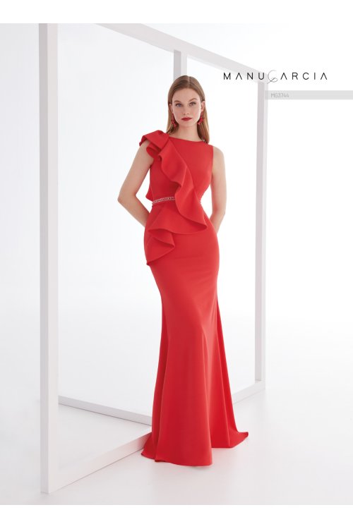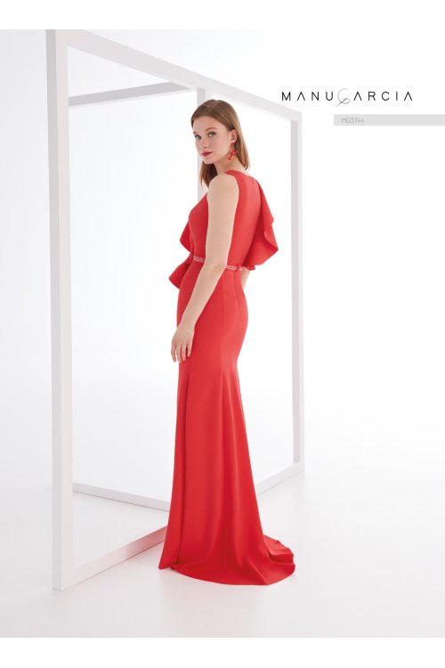 Long mermaid-style sleevless evening gown. crafted in crepe. It features a bateau neckline and a high back. The waist is adorned with a crystal-trimmed belt. while the bodice features a large ruffle that cascades to the hip. transitioning into a skirt that flows gently along the body.