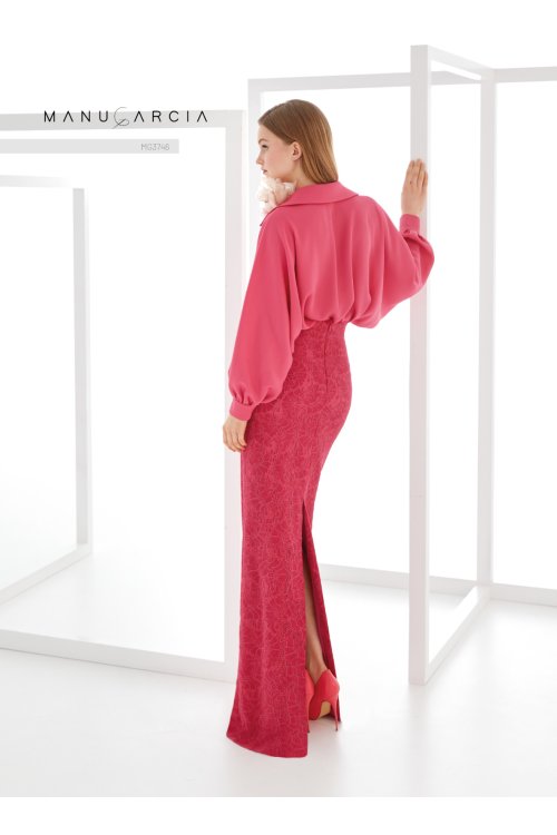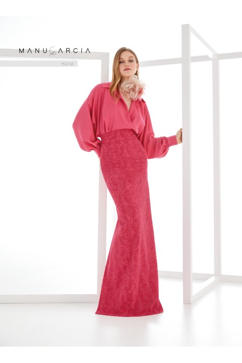 Very youthful party ensemble. composed of satin crepe blouse with a shirt collar and batwing sleeves. The look is completed with a high-waisted mermaid-style long skirt. made of lace. A flattering outfit for that special day.
