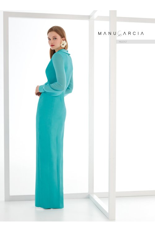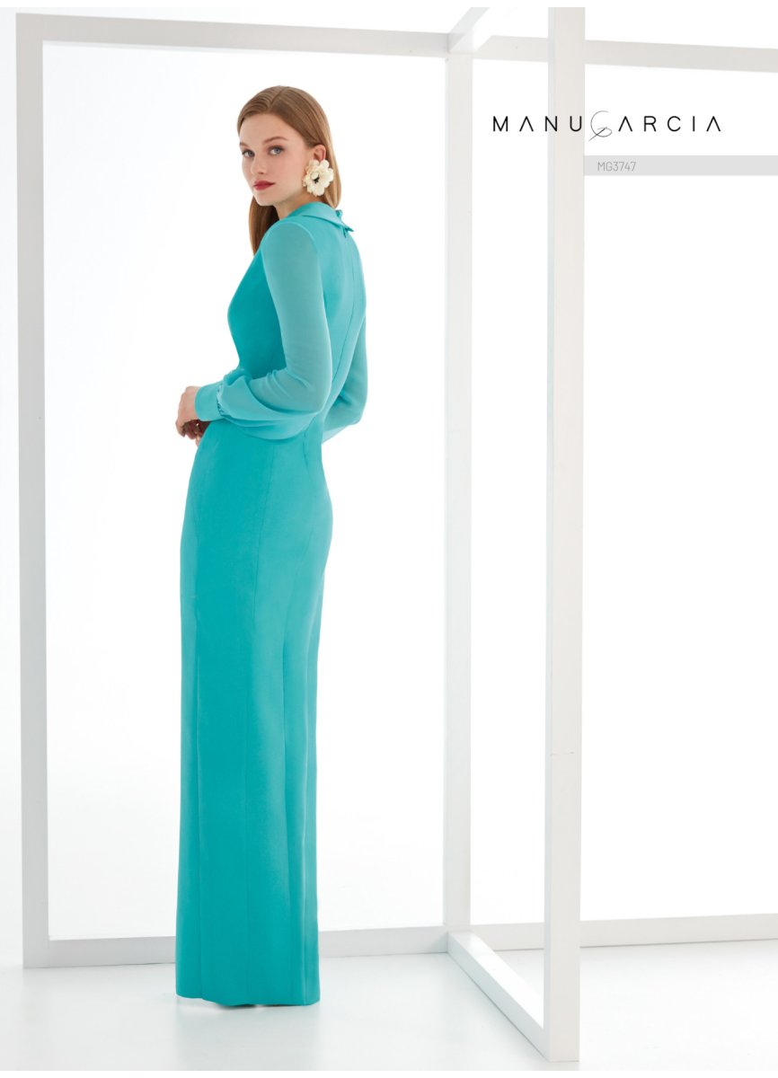 Elegance defines this long evening gown. made of satin crepe. The bodice features a wrap smoking-style neckline with flaps. positioned at the high hip. The back is high. and the sleeves are made of puffed chiffon in matching tones. The fitted skirt stands out with a wide asymmetric slit at the front.
