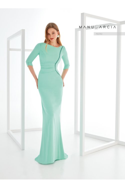 Sophisticated long evening gown. crafted in crepe. It features an elegant bateau neckline that flatters the bust. a V-shaped open back. and semi-fitted sleeves. The couture-style bodice stands out with sculpting pleats that gather toward the side seam. accented with crystal trim. and leads into a mermaid skirt. that flows smoothly over the body.