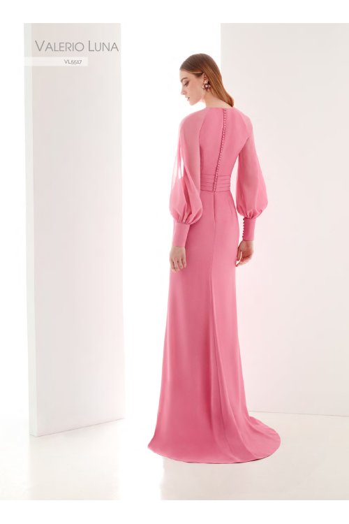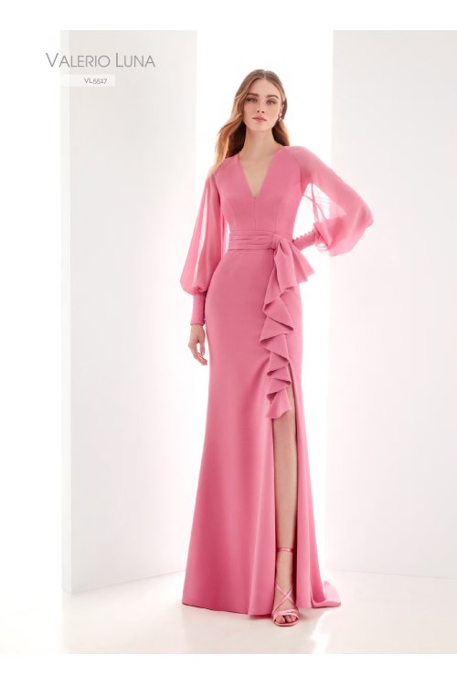 Mermaid-style party dress. made of crepe. It features a V-neckline. closed back and puffed sleeves. made of georgette. The waist is fitted with a pleated belt with a bow. giving way to a skirt with a wide opening. adorned with a cascade of ruffles.