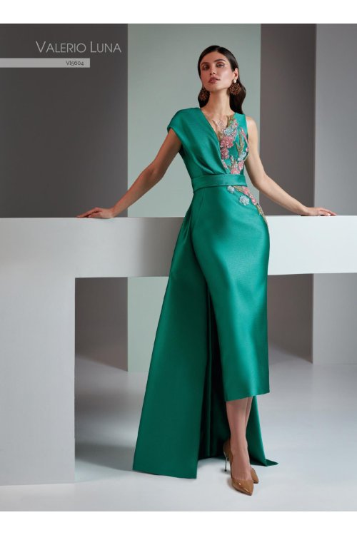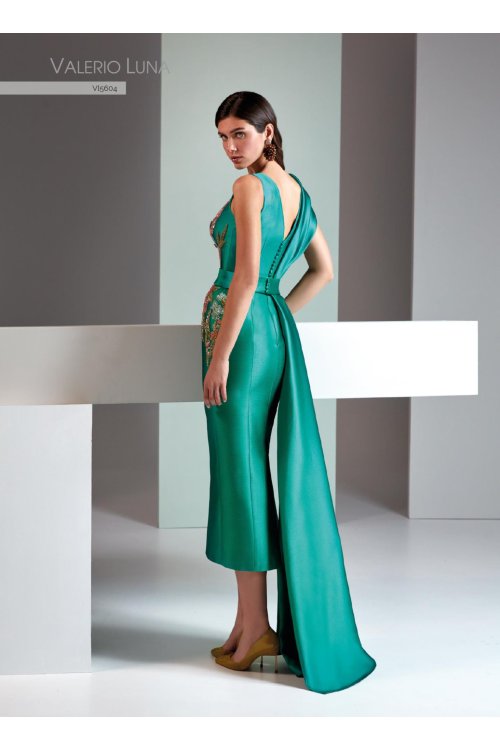 A cocktail couture dress. made in piqué. The bodice presents a modern V-neckline in the front and on the back. On one side. a band extends across the shoulder to the back. The crystal embellishments run from one side of the bodice across the hip—adding glamour to the look. along with a midi sheath skirt and a side draped overskirt.