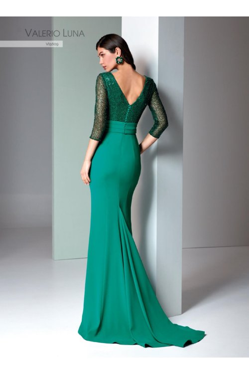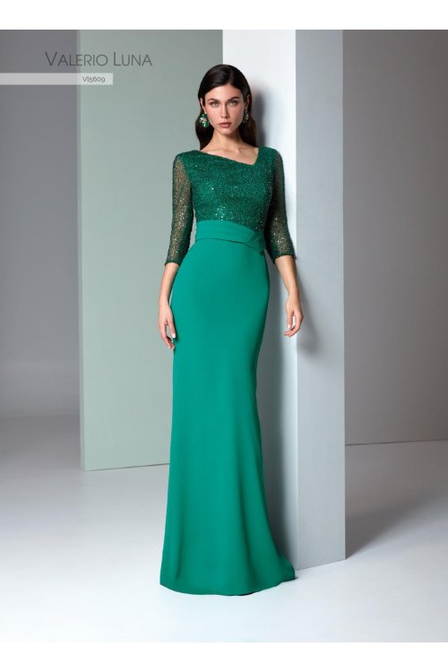 A long. mermaid-line party gown. The bodice is fully beaded. and presents an asymmetrical neckline. V-back and fitted semi-sleeve. leading to a femininely draping crepe skirt.