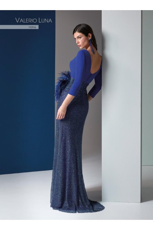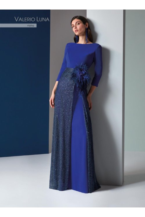 An elegant and sophisticated party gown. The bodice presents a bateau neckline and an open back with semi-transparent sleeves. and is made in crepe. The waist is adorned with an asymmetrical sash in crystal-embroidered tulle and a tonal feather flower. The skirt is cut in mermaid shape. is made in crepe with an overlay of embroidered tulle. and is open at the front.