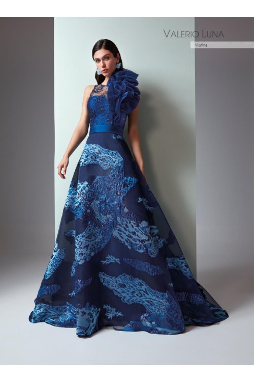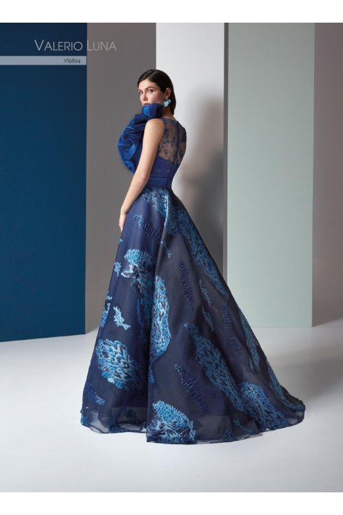 A spectacular dress. thanks to its fabric combination. The bodice. made in embroidered tulle. features a bateau fantasy neckline and back. A tonal organza detailing decorates one side. The skirt is layered. flowing in floral jacquard organza with volume.