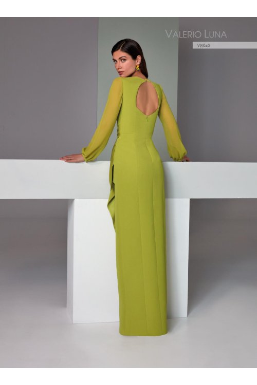 A long. satin-crepe party dress. The bodice features a square neckline. open back. and puff sleeves. The waist is adorned with an asymmetrical draped sash. that leads to a sheath skirt with a wide front slit.